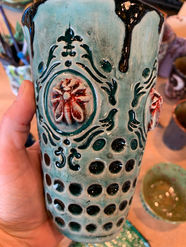 I love metal and rocks (music too!), plaster, wax, spray paint, and glass. Clay lights my fire in every way (shout out to Sue Roberts!) and I continue to be amazed with the versatility this medium offers.